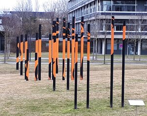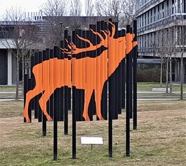 Kunst am Bau auf dem Campus Garching: "Röhrender Hirsch" von Roland Fuhrmann (2012). Aus einem wirren Stelenfeld (links) wird ein Bild montiert. Nur von einem festgelegten Punkt und der richtigen Höhe aus kann man das gesamte Kunstwerk erkennen (rechts). Hier treffen sich die Perspektivlinien der Anamorphose. In der Blickachse erscheint das verborgene Bild. | ||||