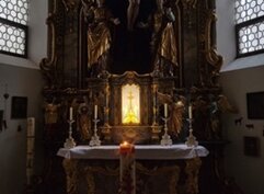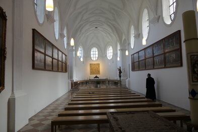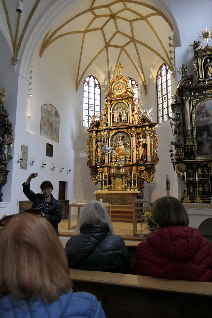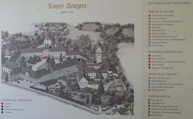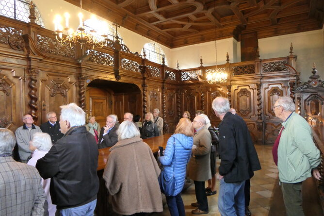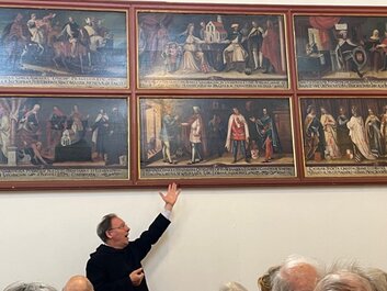 Die Wittelsbacher haben über 800 Jahre in Bayern geherrscht und bis heute unübersehbare Spuren hinterlassen. Dabei spielten sie nicht nur in Bayern, sondern auch in anderen Regionen Europas eine bedeutende Rolle. In einer interessanten Exkursion am Mittwoch, den 16. Oktober, die Hjalmar Heinen für unsere DAHC-Clubmitglieder zusammen mit Ehepartnern und Freunden geplant und organisiert hat, sind wir den Spuren der Wittelsbacher gefolgt. Der Fokus der Exkursion lag dabei besonders auf der Frühphase der dynastischen Entwicklung, dem Kloster Scheyern, das heute als Ursprung und Stammsitz der Wittelsbacher gilt, sowie der Burg Wittelsbach, deren wenige Überreste heute in Oberwittelsbach zu besichtigen sind. > Benediktiner Kloster Scheyern Erste Station der Exkursion war das Benediktinerkloster Scheyern. ![]() In einer Führung durch das Kloster und die Heilig-Kreuz-Kapelle hat Frater* Matthäus den Exkursionsteilnehmern die Kunstwerke und Gemälde erläutert und Einblicke in die wechselvolle Geschichte des Klosters Scheyern bis in die heutige Zeit gegeben. (*Frater: Klosterbruder vor der Priesterweihe) ![]() Stifterin des Klosters Scheyern ist Gräfin Haziga, sie gilt als Stammmutter der Wittelsbacher. Im Jahr 1119 wurde die Mönchsgemeinschaft dann offiziell als Benediktinerkloster eingerichtet. Es existierte in dieser Form bis zur Säkularisation und wurde 1803 aufgelöst und der Besitz versteigert. << Die einführenden Worte von Frater Matthäus zur Geschichte des Klosters Ludwig I. von Bayern veranlasste 1838 den Kauf des Klosters durch den Staat und es wurde neu besiedelt. Heute wohnen und arbeiten in dem Kloster 11 Mönche, davon 6 Priestermönche. Sie werden dabei von 80 angestellten Kräften in der Brauerei, der Gaststätte und der Landwirtschaft unterstützt. ![]() Wesentliche Ereignisse der Geschichte des Klosters sind in großen Bildtafeln festgehalten, die uns Frater Matthäus erläutert hat. ![]() Von besonderer religiöser Bedeutung ist auch heute noch das „Scheyrer Kreuz“, eine Kreuzreliquie, die im Kloster Scheyern aufbewahrt wird. Dabei handelt es sich um einen Splitter des Heiligen Kreuzes, der in einer Monstranz in der Heilig-Kreuz- Kapelle der Klosterkirche präsentiert wird. ![]() (c) DAHC - Führung durch die Sakristei von Kloster Scheyern Nach einem zünftigen Lunch mit der Möglichkeit einer „Bierprobe“ im Klosterbräu und einer kurzen Busfahrt wurde Oberwittelsbach erreicht. | ||